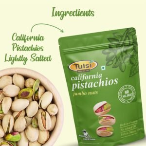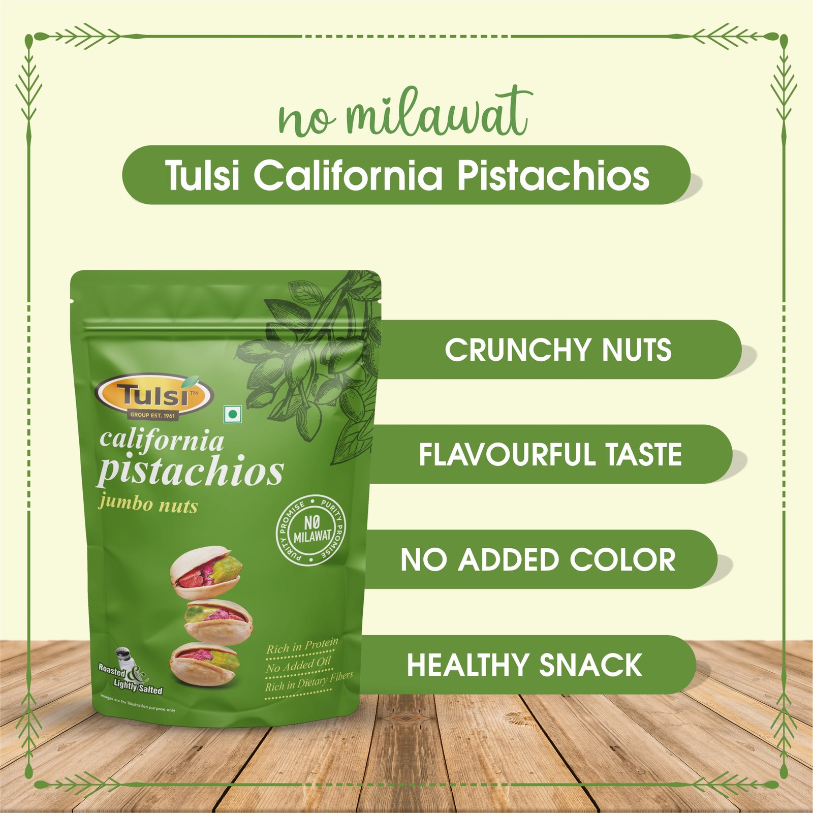 Tulsi Roasted California Pistachios in Lightly Salted flavor is a wonderful and tasty snack. Pistachios are one of the oldest and healthiest nuts known to man. Along with the traditional benefits offered by all nuts, they contain specific properties that give them a unique advantage as a dietary supplement. The carbohydrates, proteins, vitamins, and minerals, are all equally beneficial for the human body. They offer day-to-day benefits such as maintaining moisture in the skin, improving digestion, and protecting the eye from developing early symptoms of aging. A 28-gram serving of pistachios contains good amounts of fiber, protein, potassium, zinc, phosphorus, vitamin B6, and manganese. They have a rich and nutty taste, and they contain other important nutrients too. The antioxidants in pistachios are some of the highest amongst nuts.